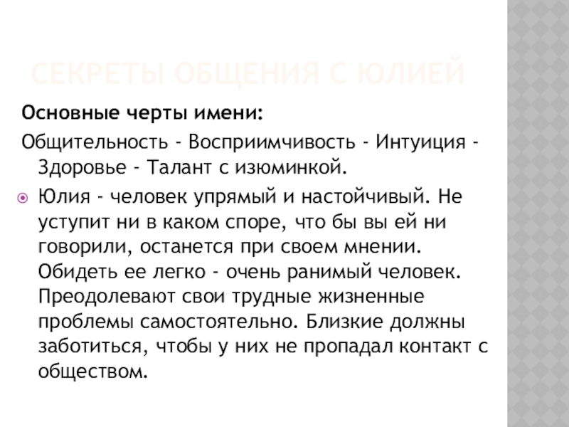 Юлия - человек упрямый и настойчивый. Не уступит ни в каком споре, что бы вы ей ни говорили, останется при своем мнении. Обидеть ее легко - очень ранимый человек. Преодолевают свои трудные жизненные проблемы самостоятельно. Близкие должны заботиться, чтобы у них не пропадал контакт с обществом.