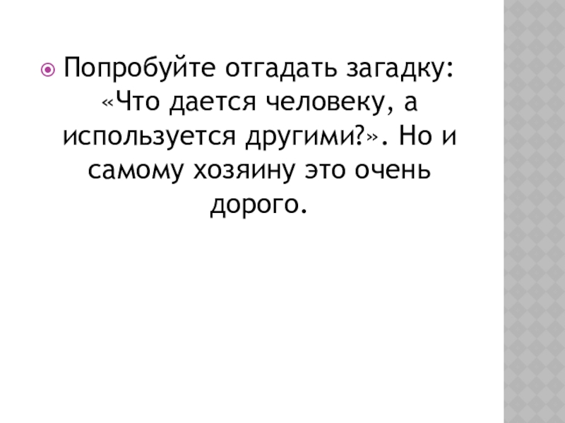 Слайд 2Попробуйте отгадать загадку: «Что дается человеку, а используется другими?». Но и
