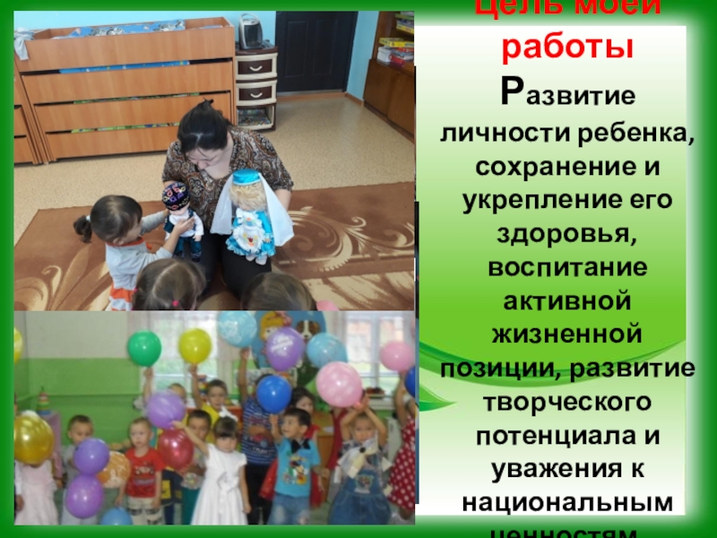 Слайд 5Цель моей работы Развитие личности ребенка, сохранение и укрепление его здоровья, воспитание