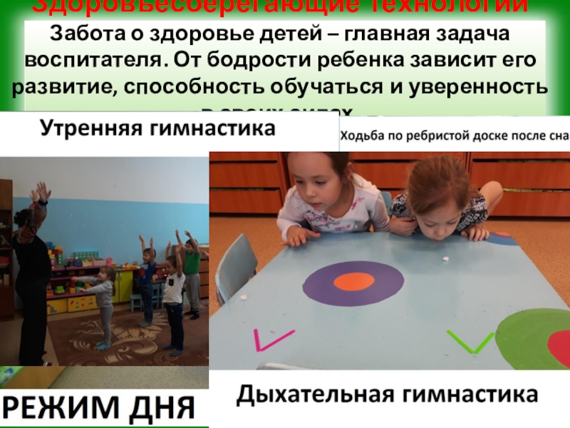 Слайд 10Здоровьесберегающие технологии Забота о здоровье детей – главная задача воспитателя. От бодрости