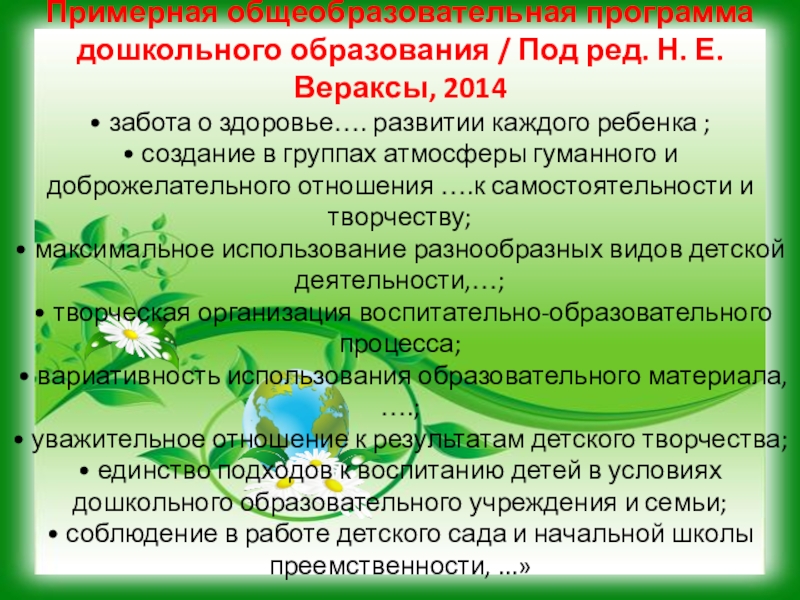 / Под ред. Н. Е. Вераксы, 2014 • забота о здоровье…. развитии каждого ребенка ; • создание в группах атмосферы гуманного и доброжелательного отношения ….к самостоятельности и творчеству; • максимальное использование разнообразных видов детской деятельности,…; • творческая организация воспитательно-образовательного процесса; • вариативность использования образовательного материала, ….; • уважительное отношение к результатам детского творчества; • единство подходов к воспитанию детей в условиях дошкольного образовательного учреждения и семьи; • соблюдение в работе детского сада и начальной школы преемственности, ...»