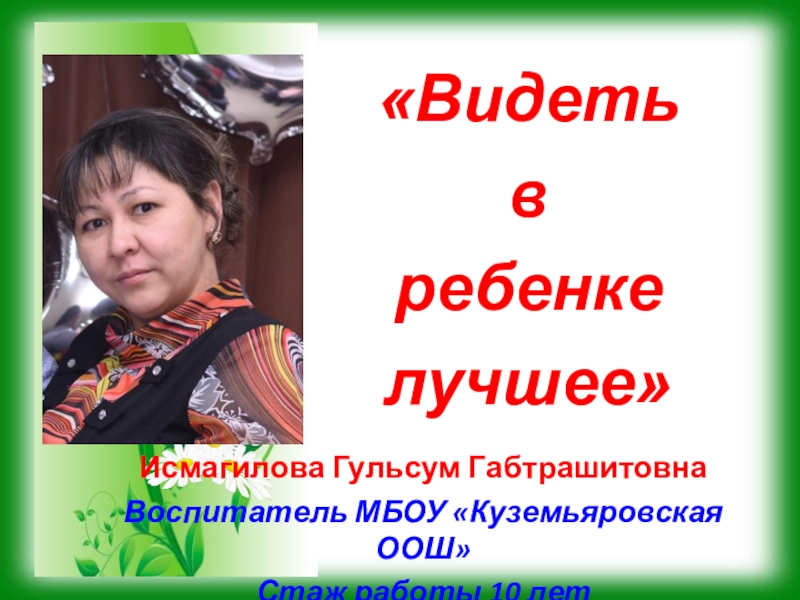 «Видеть в ребенке лучшее»Исмагилова Гульсум ГабтрашитовнаВоспитатель МБОУ «Куземьяровская ООШ»Стаж работы 10 лет