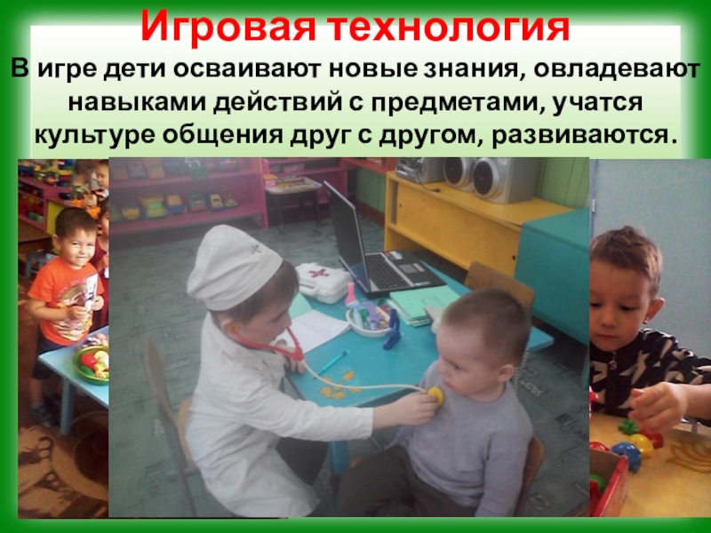 Игровая технология В игре дети осваивают новые знания, овладевают навыками действий с предметами, учатся культуре общения друг