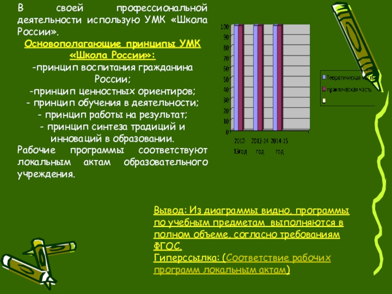 Вывод: Из диаграммы видно, программы по учебным предметам выполняются в полном объеме, согласно требованиям ФГОС.