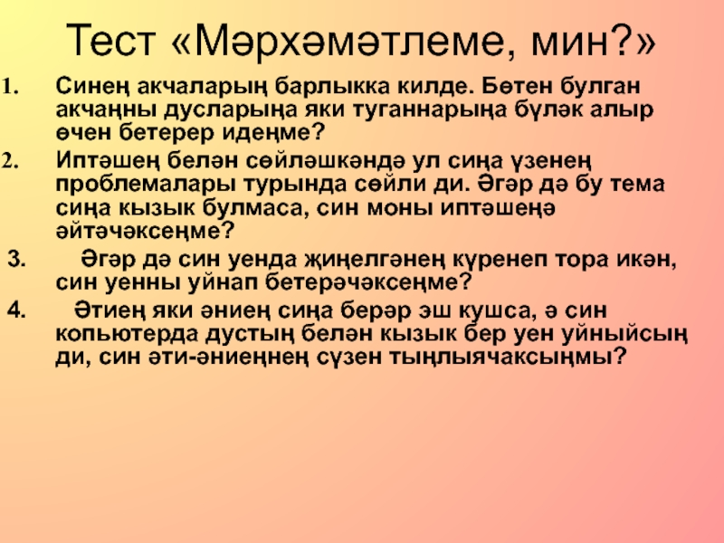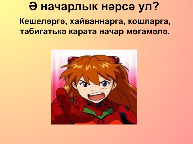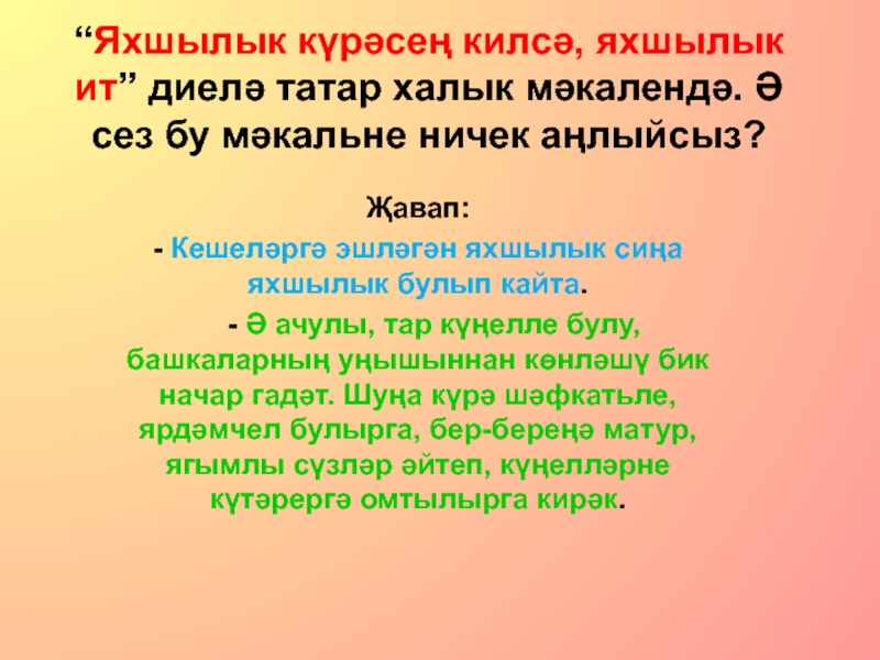 - Ә ачулы, тар күңелле булу, башкаларның уңышыннан көнләшү бик начар гадәт. Шуңа күрә шәфкатьле, ярдәмчел булырга, бер-береңә матур, ягымлы сүзләр әйтеп, күңелләрне күтәрергә омтылырга кирәк.