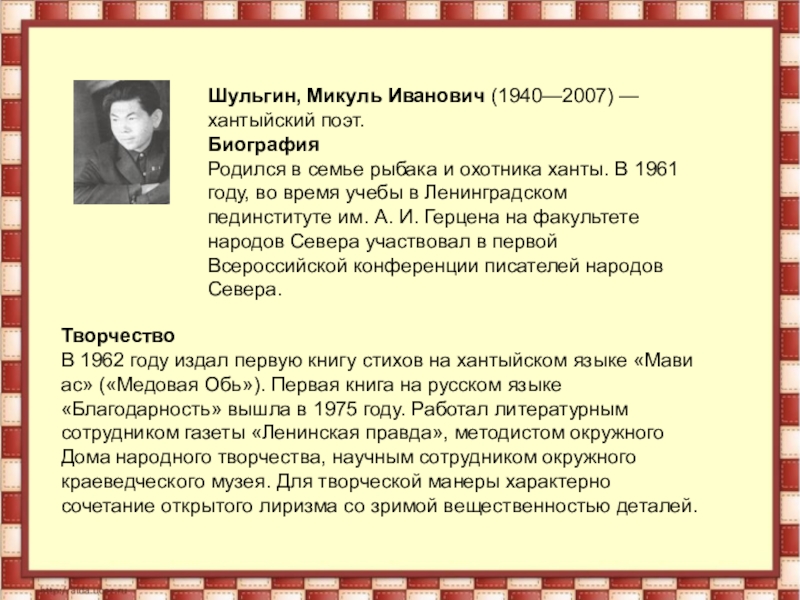 В 1962 году издал первую книгу стихов на хантыйском языке «Мави ас» («Медовая Обь»). Первая книга на русском языке «Благодарность» вышла в 1975 году. Работал литературным сотрудником газеты «Ленинская правда», методистом окружного Дома народного творчества, научным сотрудником окружного краеведческого музея. Для творческой манеры характерно сочетание открытого лиризма со зримой вещественностью деталей.