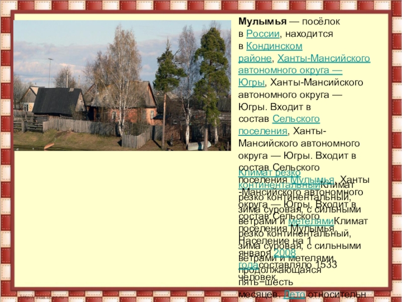 Мулымья — посёлок в России, находится в Кондинском районе, Ханты-Мансийского автономного округа — Югры, Ханты-Мансийского автономного округа — Югры. Входит в состав Сельского поселения, Ханты-Мансийского автономного округа — Югры. Входит в состав Сельского поселения Мулымья, Ханты-Мансийского автономного округа — Югры. Входит в состав Сельского поселения Мулымья. Население на 1 января 2008 годасоставляло 1533 человек.