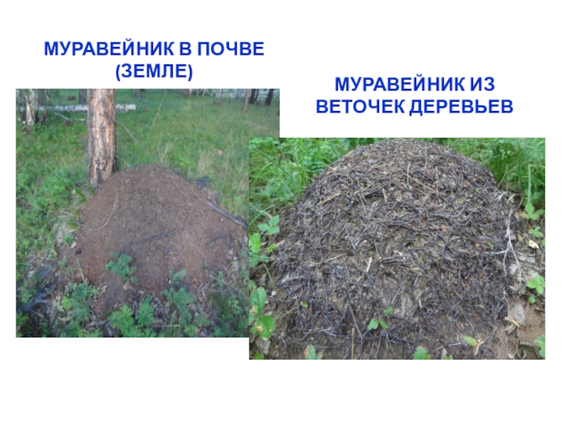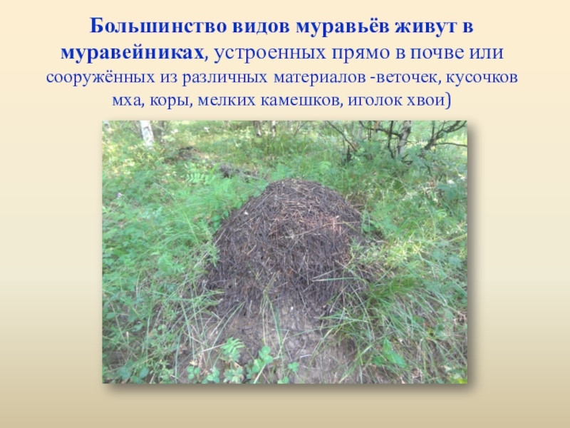 Слайд 9Большинство видов муравьёв живут в муравейниках, устроенных прямо в почве или