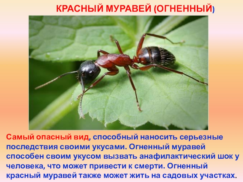 способный наносить серьезные последствия своими укусами. Огненный муравей способен своим укусом вызвать анафилактический шок у человека, что может привести к летальному исходу. Огненный красный муравей редко живет в помещении, чаще их можно встретить на садовых участках.