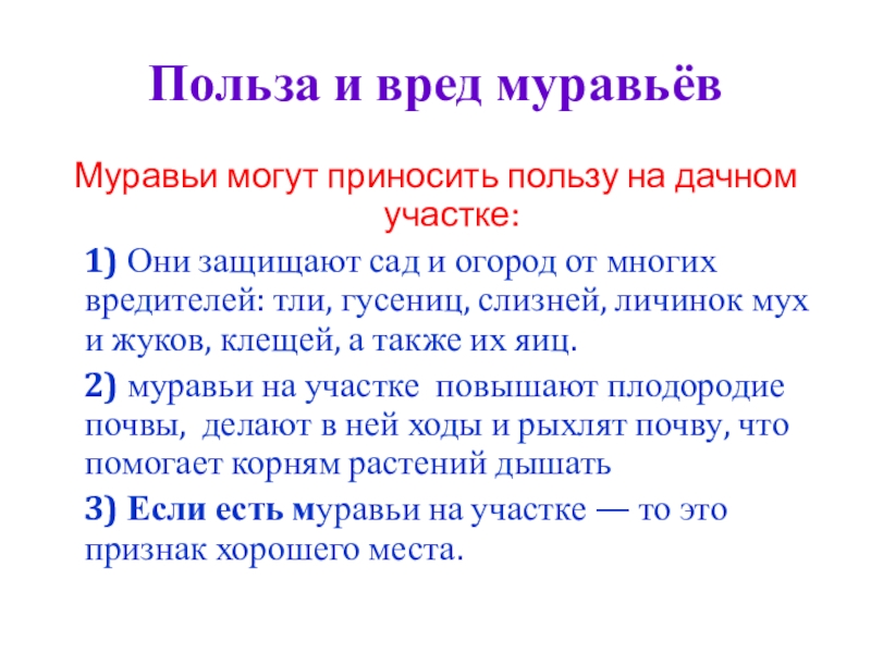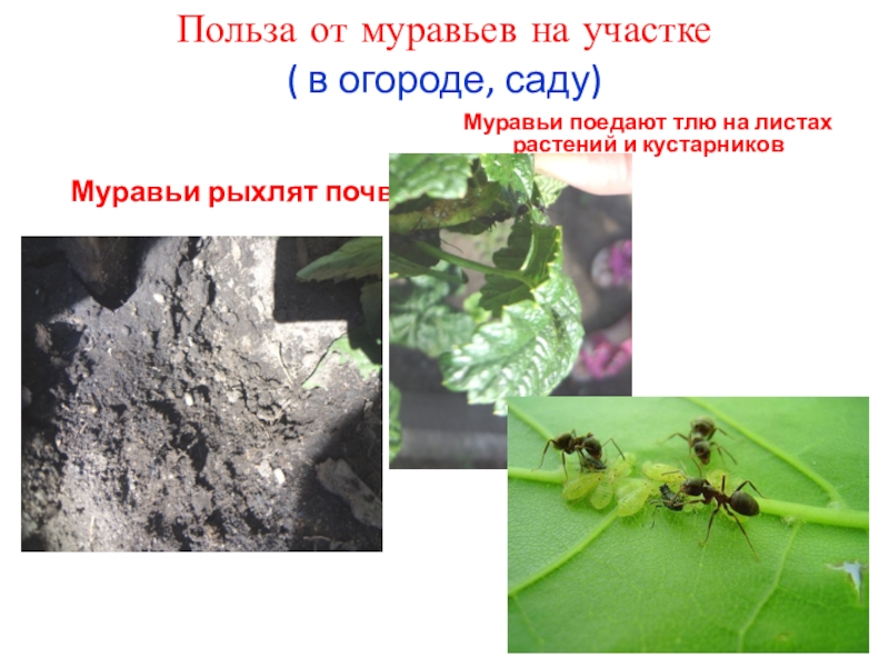 2) муравьи на участке повышают плодородие почвы, делают в ней ходы и рыхлят почву, что помогает корням растений дышать