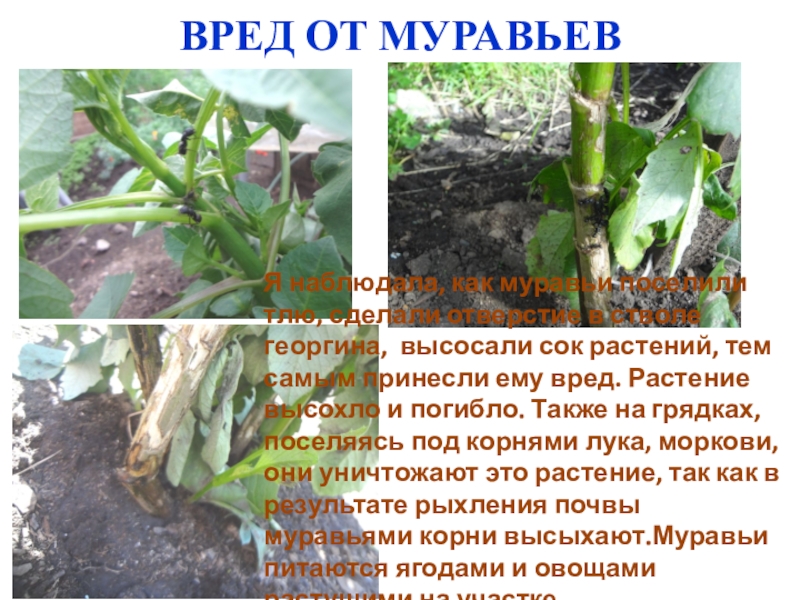 стволе георгина, высосали сок растений, тем самым принесли ему вред. Растение высохло и погибло. Также на грядках, поселяясь под корнями лука, моркови, они уничтожают это растение, так как в результате рыхления почвы муравьями корни высыхают.Муравьи питаются ягодами и овощами растущими на участке