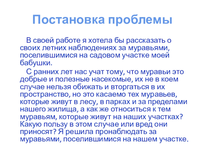 рассказать о своих летних наблюдениях за муравьями, поселившимися на садовом участке моей бабушки.