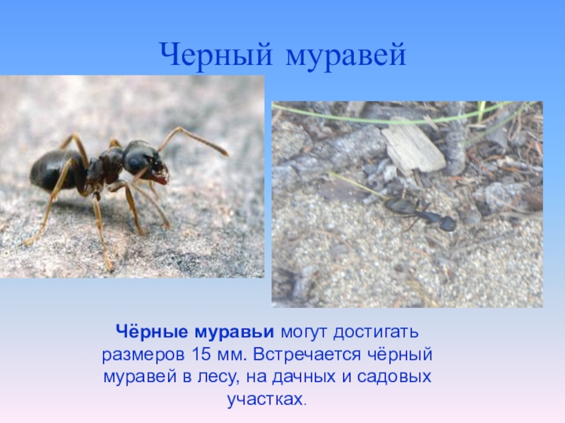 Чёрные муравьи могут достигать размеров 15 мм. Встречается чёрный муравей