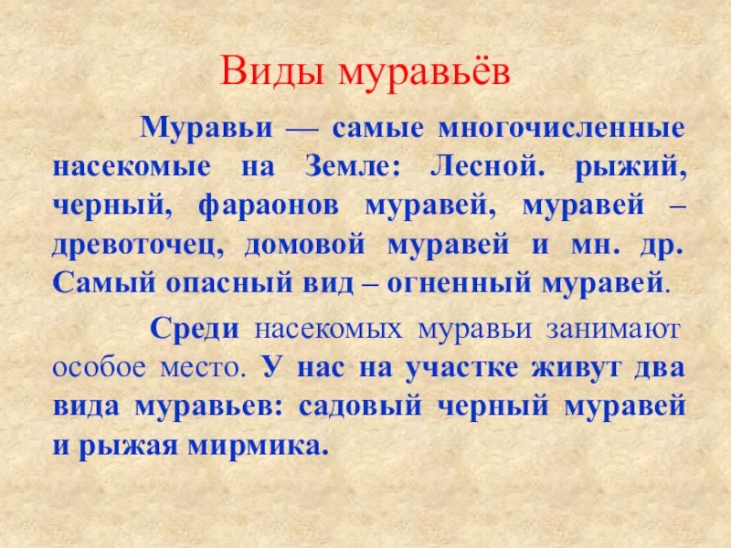 на Земле: Лесной. рыжий, черный, фараонов муравей, муравей –древоточец, домовой муравей и мн. др. Самый опасный вид – огненный муравей.