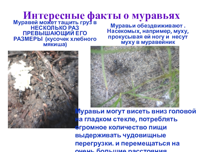 Муравьи могут висеть вниз головой на гладком стекле, потреблять огромное количество пищи выдерживать чудовищные перегрузки. и перемещаться на очень большие расстояния.
