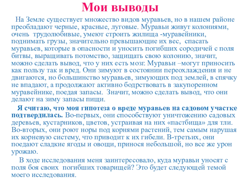 Я считаю, что моя гипотеза о вреде муравьев на садовом участке подтвердилась. Во-первых, они способствуют уничтожению садовых деревьев, кустарников, цветов, устраивая на них «пастбища» для тли. Во-вторых, они роют норы под корнями растений, тем самым нарушая их корневую систему, что приводит к их гибели. В-третьих, они поедают сладкие ягоды и овощи, принося небольшой, но все же урон урожаю.