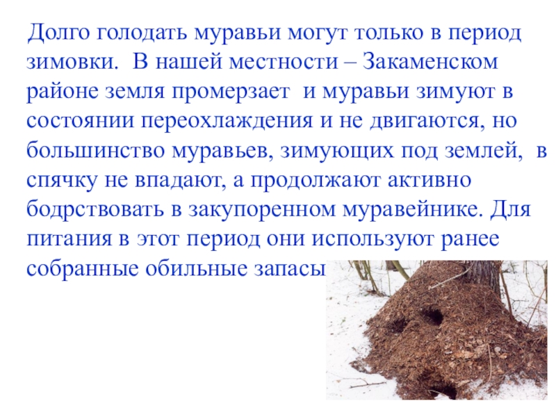 нашей местности – Закаменском районе земля промерзает и муравьи зимуют в состоянии переохлаждения и не двигаются, но большинство муравьев, зимующих под землей, в спячку не впадают, а продолжают активно бодрствовать в закупоренном муравейнике. Для питания в этот период они используют ранее собранные обильные запасы.