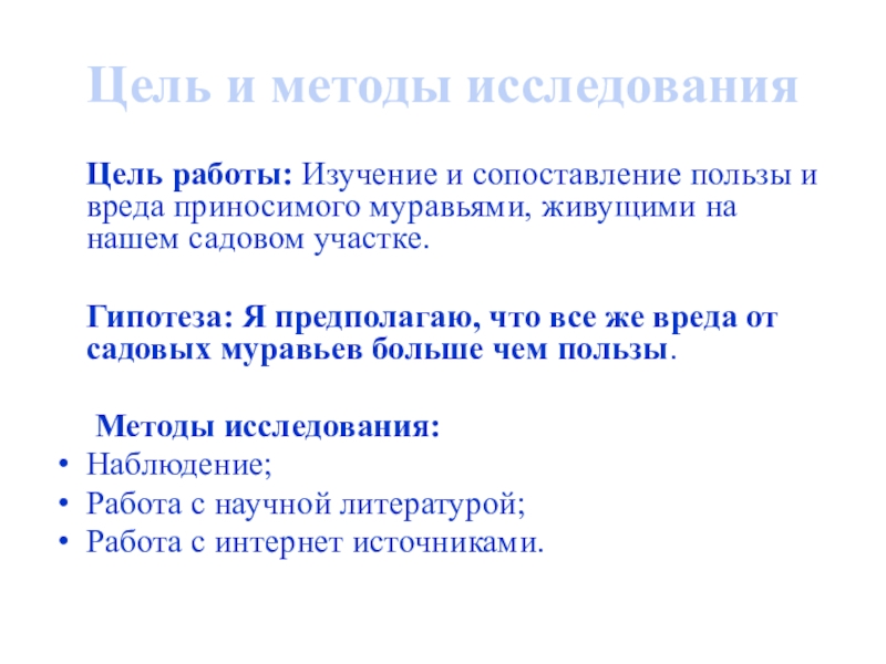Гипотеза: Я предполагаю, что все же вреда от садовых муравьев больше чем пользы.