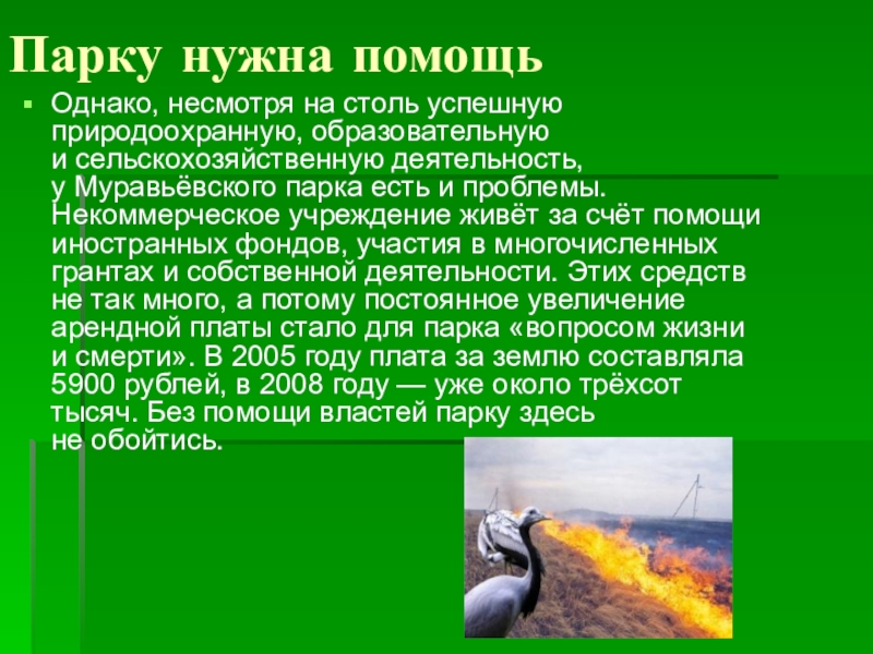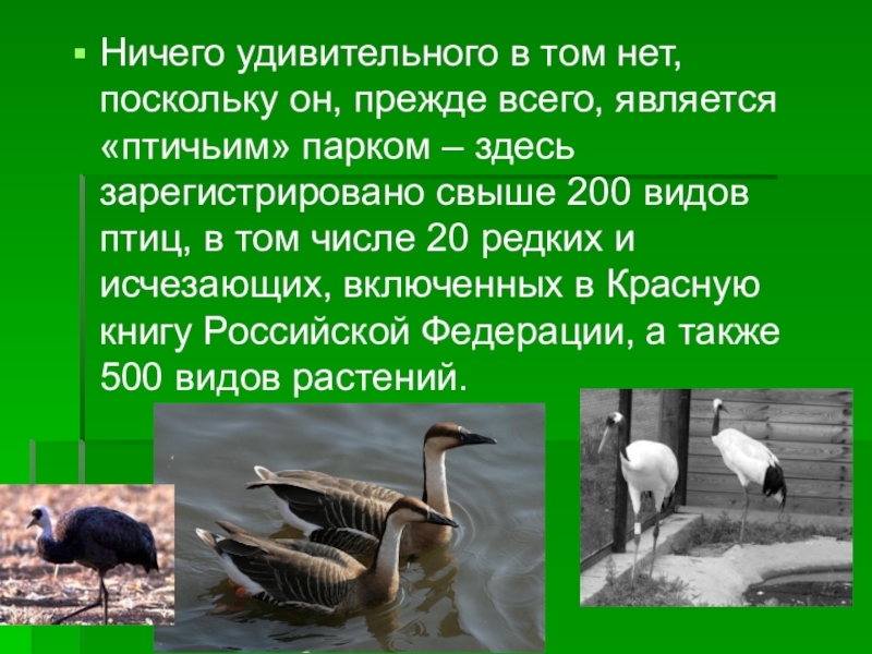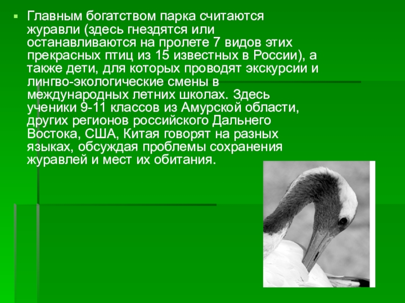 Слайд 12Главным богатством парка считаются журавли (здесь гнездятся или останавливаются на пролете