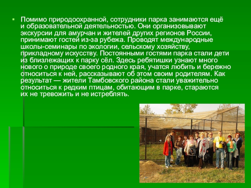для амурчан и жителей других регионов России, принимают гостей из-за рубежа. Проводят международные школы-семинары по экологии, сельскому хозяйству, прикладному искусству. Постоянными гостями парка стали дети из близлежащих к парку сёл. Здесь ребятишки узнают много нового о природе своего родного края, учатся любить и бережно относиться к ней, рассказывают об этом своим родителям. Как результат — жители Тамбовского района стали уважительно относиться к редким птицам, обитающим в парке, стараются их не тревожить и не истреблять.