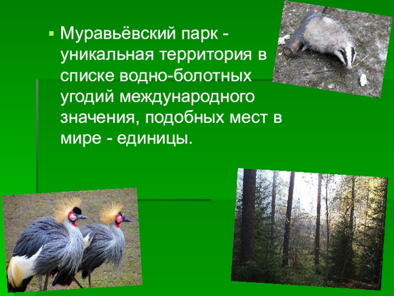 Слайд 6Муравьёвский парк - уникальная территория в списке водно-болотных угодий международного значения,