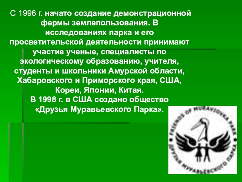 и его просветительской деятельности принимают участие ученые, специалисты по экологическому образованию, учителя, студенты и школьники Амурской области, Хабаровского и Приморского края, США, Кореи, Японии, Китая. В 1998 г. в США создано общество «Друзья Муравьевского Парка».
