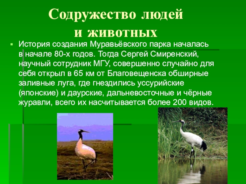 создания Муравьёвского парка началась в начале 80-х годов. Тогда Сергей Смиренский, научный сотрудник МГУ, совершенно случайно для себя открыл в 65 км от Благовещенска обширные заливные луга, где гнездились уссурийские (японские) и даурские, дальневосточные и чёрные журавли, всего их насчитывается более 200 видов.