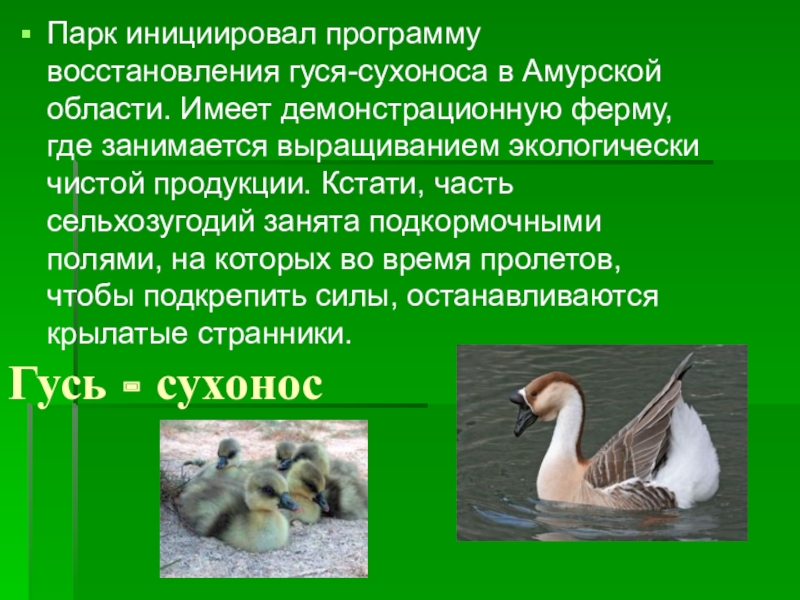 Парк инициировал программу восстановления гуся-сухоноса в Амурской области. Имеет
