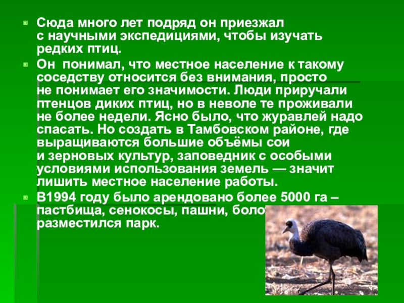 Он понимал, что местное население к такому соседству относится без внимания, просто не понимает его значимости. Люди приручали птенцов диких птиц, но в неволе те проживали не более недели. Ясно было, что журавлей надо спасать. Но создать в Тамбовском районе, где выращиваются большие объёмы сои и зерновых культур, заповедник с особыми условиями использования земель — значит лишить местное население работы.