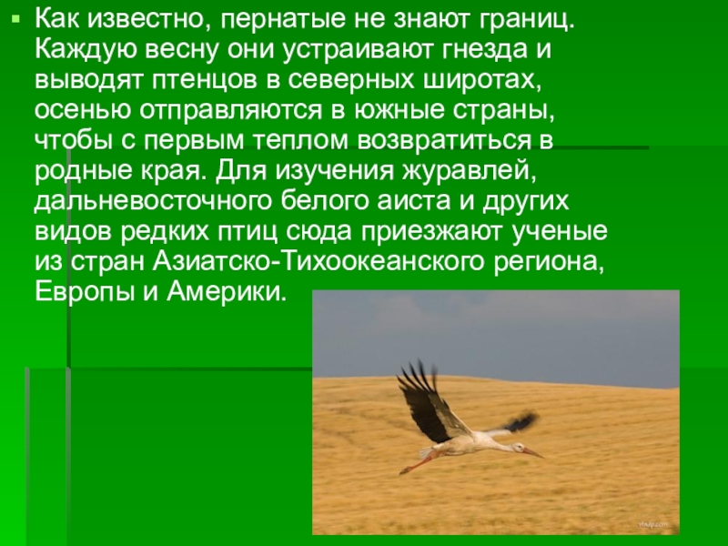 и выводят птенцов в северных широтах, осенью отправляются в южные страны, чтобы с первым теплом возвратиться в родные края. Для изучения журавлей, дальневосточного белого аиста и других видов редких птиц сюда приезжают ученые из стран Азиатско-Тихоокеанского региона, Европы и Америки.