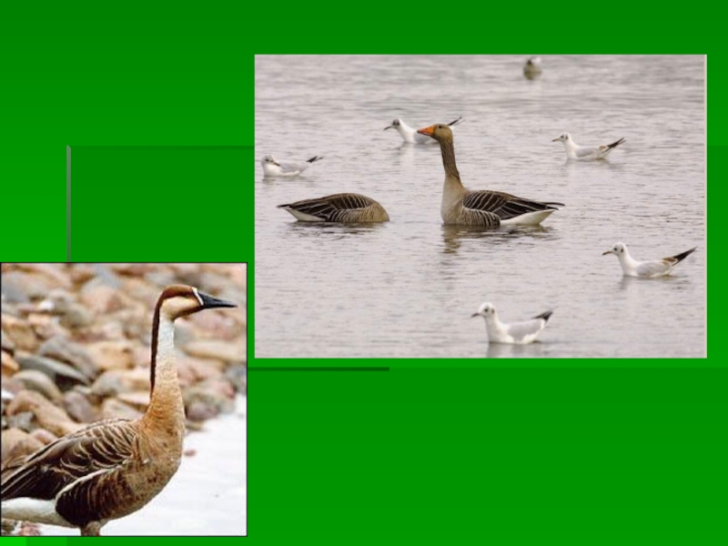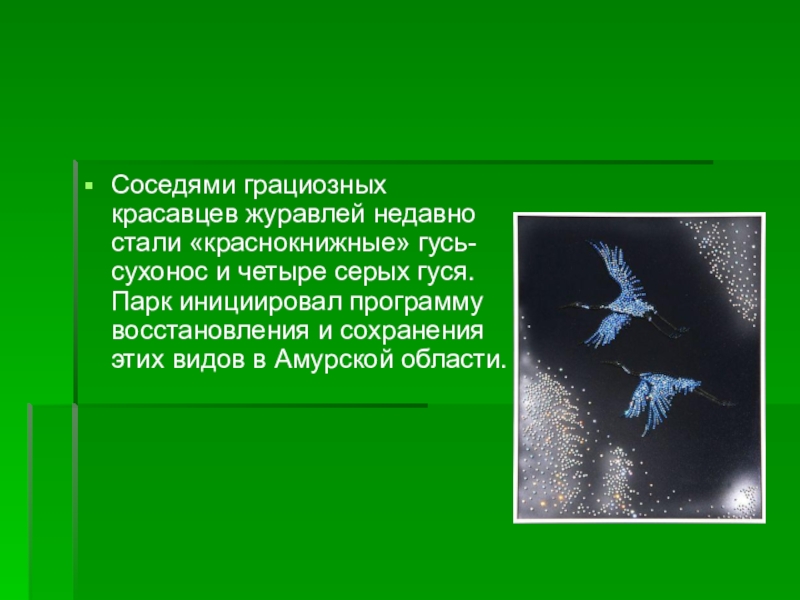 Слайд 16Соседями грациозных красавцев журавлей недавно стали «краснокнижные» гусь-сухонос и четыре серых гуся.