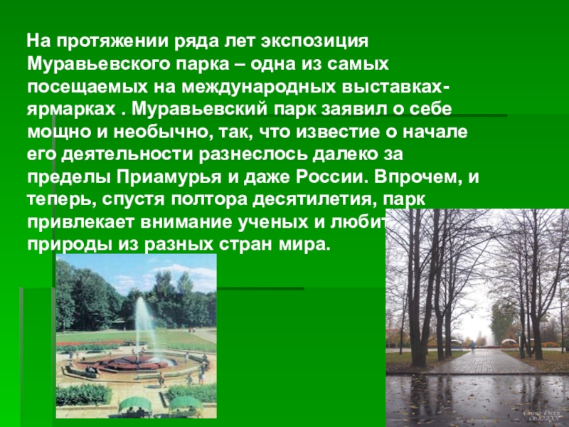 – одна из самых посещаемых на международных выставках-ярмарках . Муравьевский парк заявил о себе мощно и необычно, так, что известие о начале его деятельности разнеслось далеко за пределы Приамурья и даже России. Впрочем, и теперь, спустя полтора десятилетия, парк привлекает внимание ученых и любителей природы из разных стран мира.