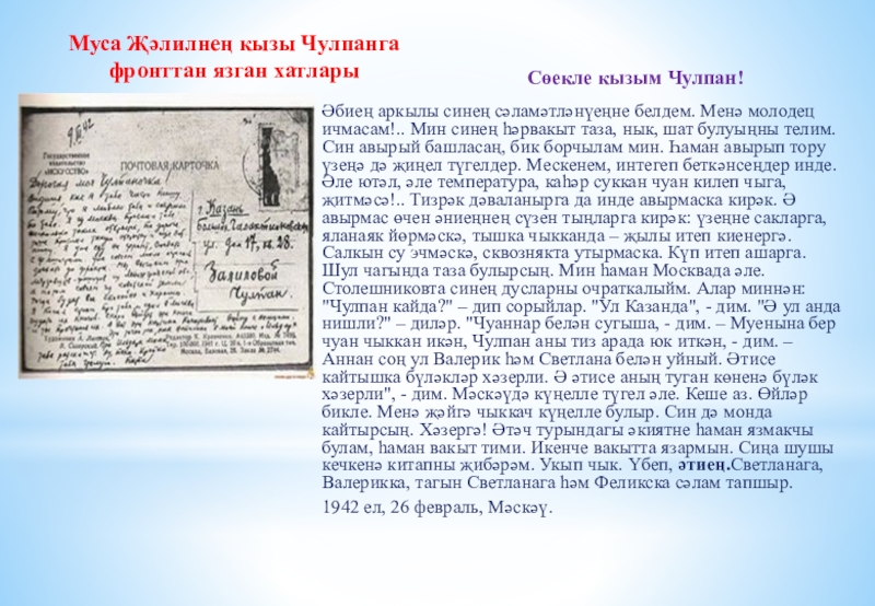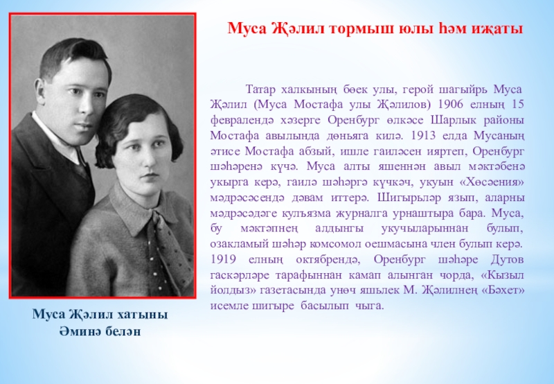 улы, герой шагыйрь Муса Җәлил (Муса Мостафа улы Җәлилов) 1906 елның 15 февралендә хәзерге Оренбург өлкәсе Шарлык районы Мостафа авылында дөньяга килә. 1913 елда Мусаның әтисе Мостафа абзый, ишле гаиләсен ияртеп, Оренбург шәһәренә күчә. Муса алты яшеннән авыл мәктәбенә укырга керә, гаилә шәһәргә күчкәч, укуын «Хөсәения» мәдрәсәсендә дәвам иттерә. Шигырьләр язып, аларны мәдрәсәдәге кулъязма журналга урнаштыра бара. Муса, бу мәктәпнең алдынгы укучыларыннан булып, озакламый шәһәр комсомол оешмасына член булып керә. 1919 елның октябрендә, Оренбург шәһәре Дутов гаскәрләре тарафыннан камап алынган чорда, «Кызыл йолдыз» газетасында унөч яшьлек М. Җәлилнең «Бәхет» исемле шигыре басылып чыга.