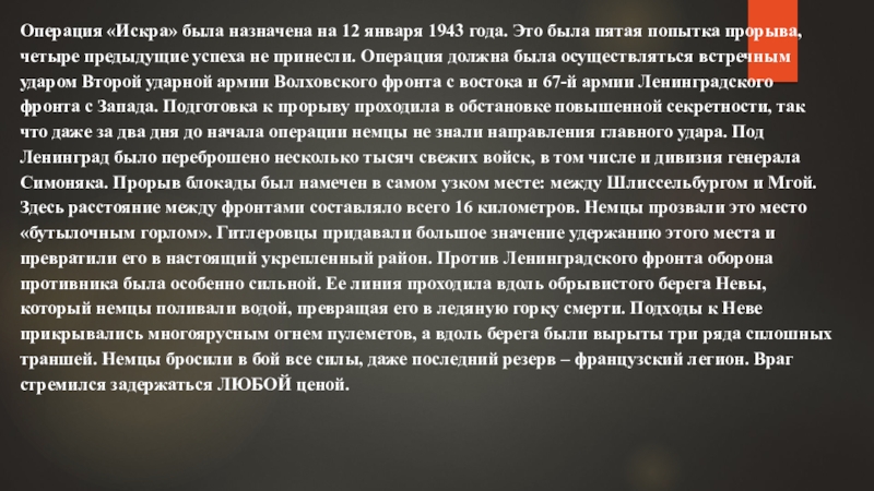 пятая попытка прорыва, четыре предыдущие успеха не принесли. Операция должна была осуществляться встречным ударом Второй ударной армии Волховского фронта с востока и 67-й армии Ленинградского фронта с Запада. Подготовка к прорыву проходила в обстановке повышенной секретности, так что даже за два дня до начала операции немцы не знали направления главного удара. Под Ленинград было переброшено несколько тысяч свежих войск, в том числе и дивизия генерала Симоняка. Прорыв блокады был намечен в самом узком месте: между Шлиссельбургом и Мгой. Здесь расстояние между фронтами составляло всего 16 километров. Немцы прозвали это место «бутылочным горлом». Гитлеровцы придавали большое значение удержанию этого места и превратили его в настоящий укрепленный район. Против Ленинградского фронта оборона противника была особенно сильной. Ее линия проходила вдоль обрывистого берега Невы, который немцы поливали водой, превращая его в ледяную горку смерти. Подходы к Неве прикрывались многоярусным огнем пулеметов, а вдоль берега были вырыты три ряда сплошных траншей. Немцы бросили в бой все силы, даже последний резерв – французский легион. Враг стремился задержаться ЛЮБОЙ ценой.