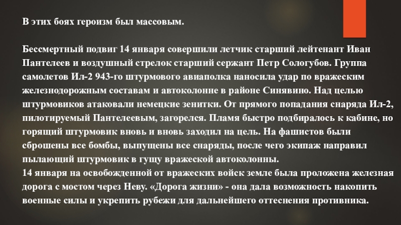В этих боях героизм был массовым. Бессмертный подвиг 14 января совершили летчик старший лейтенант Иван Пантелеев и воздушный