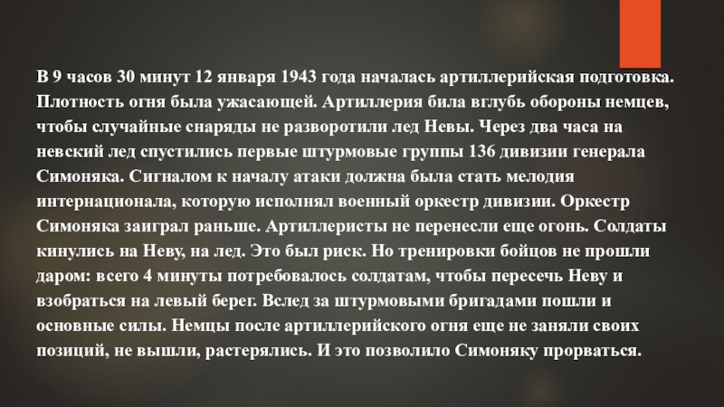 подготовка. Плотность огня была ужасающей. Артиллерия била вглубь обороны немцев, чтобы случайные снаряды не разворотили лед Невы. Через два часа на невский лед спустились первые штурмовые группы 136 дивизии генерала Симоняка. Сигналом к началу атаки должна была стать мелодия интернационала, которую исполнял военный оркестр дивизии. Оркестр Симоняка заиграл раньше. Артиллеристы не перенесли еще огонь. Солдаты кинулись на Неву, на лед. Это был риск. Но тренировки бойцов не прошли даром: всего 4 минуты потребовалось солдатам, чтобы пересечь Неву и взобраться на левый берег. Вслед за штурмовыми бригадами пошли и основные силы. Немцы после артиллерийского огня еще не заняли своих позиций, не вышли, растерялись. И это позволило Симоняку прорваться.