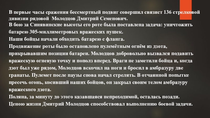 В первые часы сражения бессмертный подвиг совершил связист 136 стрелковой дивизии рядовой Молодцов Дмитрий Семенович.В бою за
