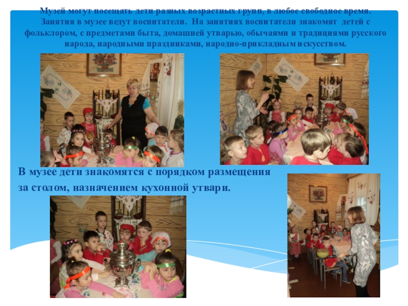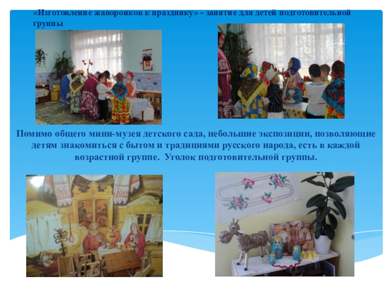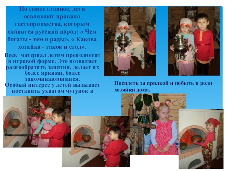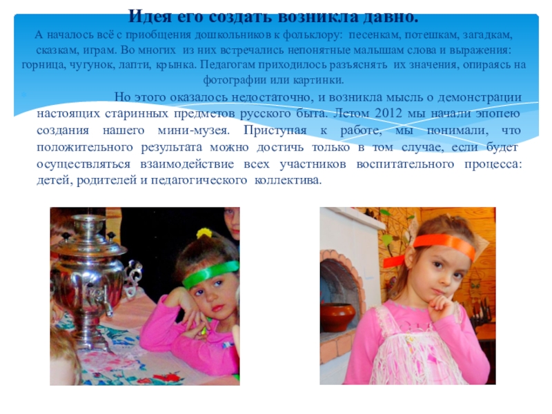А началось всё с приобщения дошкольников к фольклору: песенкам, потешкам, загадкам, сказкам, играм. Во многих из них встречались непонятные малышам слова и выражения: горница, чугунок, лапти, крынка. Педагогам приходилось разъяснять их значения, опираясь на фотографии или картинки.