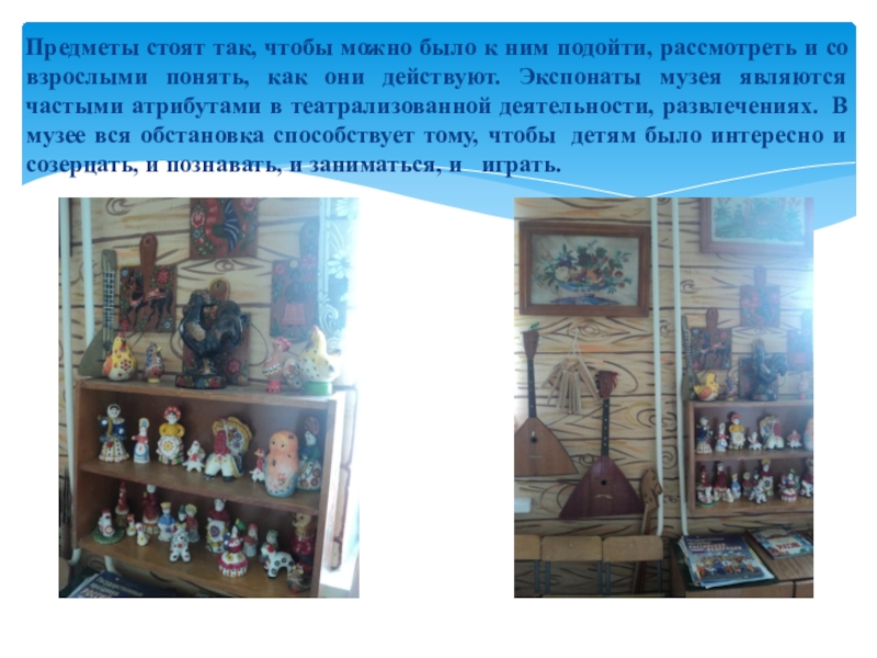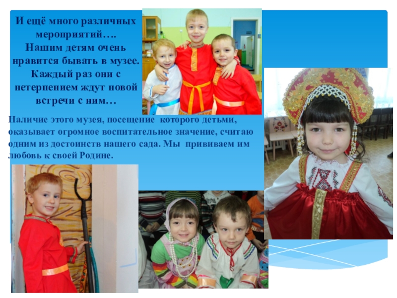 Наличие этого музея, посещение которого детьми, оказывает огромное воспитательное значение, считаю одним из достоинств нашего сада. Мы прививаем им любовь к своей Родине.