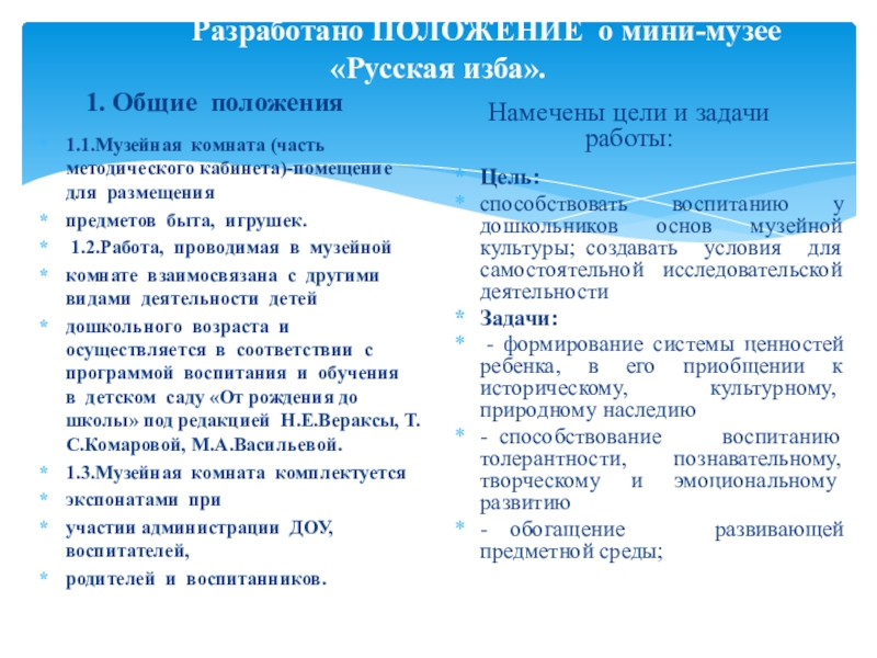 способствовать воспитанию у дошкольников основ музейной культуры; создавать условия для самостоятельной исследовательской деятельности