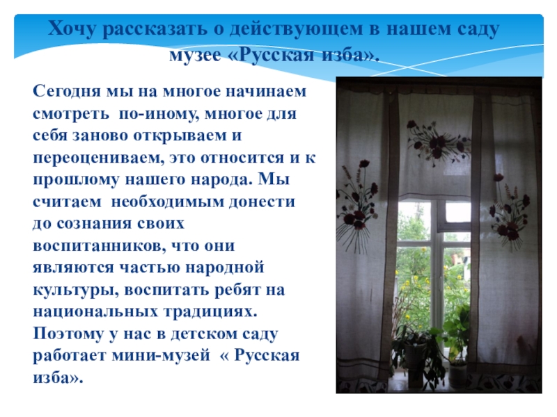 Хочу рассказать о действующем в нашем саду музее «Русская изба».