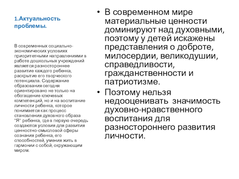 В современном мире материальные ценности доминируют над духовными, поэтому у детей искажены представления о доброте, милосердии, великодушии, справедливости, гражданственности и патриотизме.