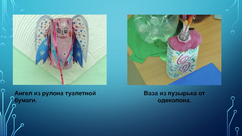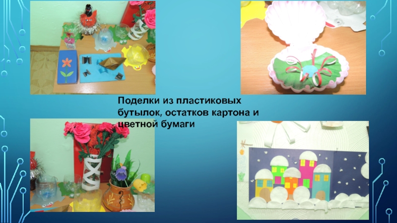 Слайд 7Поделки из пластиковых бутылок, остатков картона и цветной бумаги