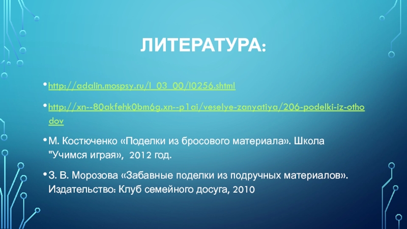 Литература:http://adalin.mospsy.ru/l_03_00/l0256.shtmlhttp://xn--80akfehk0bm6g.xn--p1ai/veselye-zanyatiya/206-podelki-iz-othodovМ. Костюченко «Поделки из бросового материала». Школа