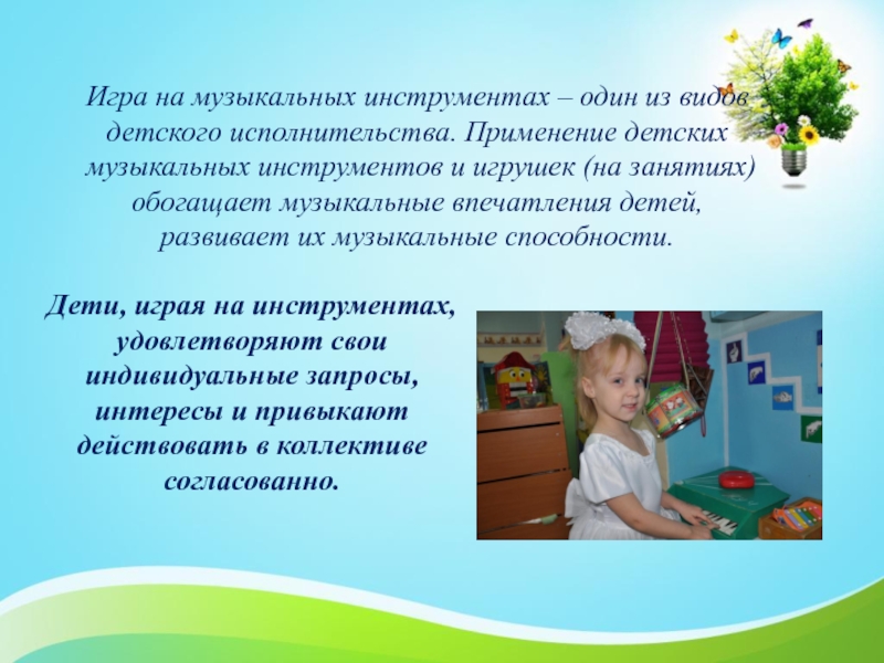 Дети, играя на инструментах, удовлетворяют свои индивидуальные запросы, интересы и привыкают действовать в коллективе согласованно.