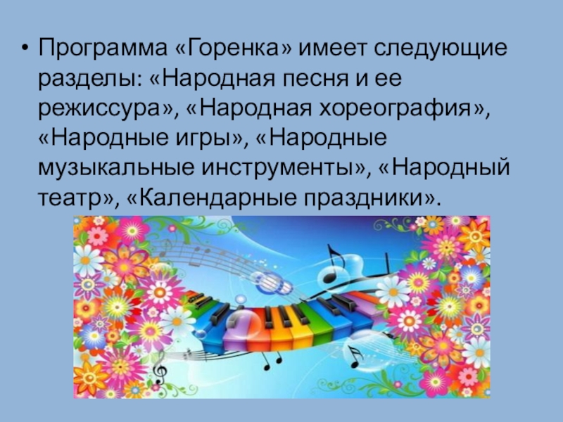 Слайд 6Программа «Горенка» имеет следующие разделы: «Народная песня и ее режиссура», «Народная