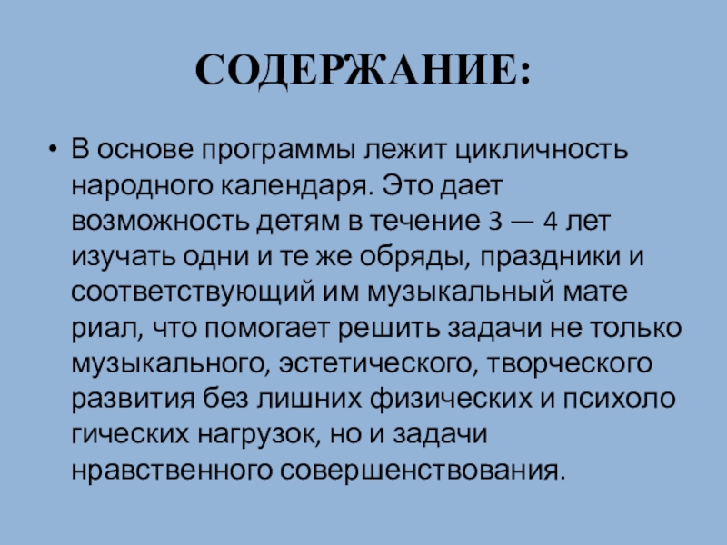 СОДЕРЖАНИЕ:В основе программы лежит цикличность народного календаря. Это дает возможность детям в течение 3 — 4 лет изучать одни и те же обряды, праздники и соответствующий им музыкальный мате­риал, что помогает решить задачи не только музыкального,