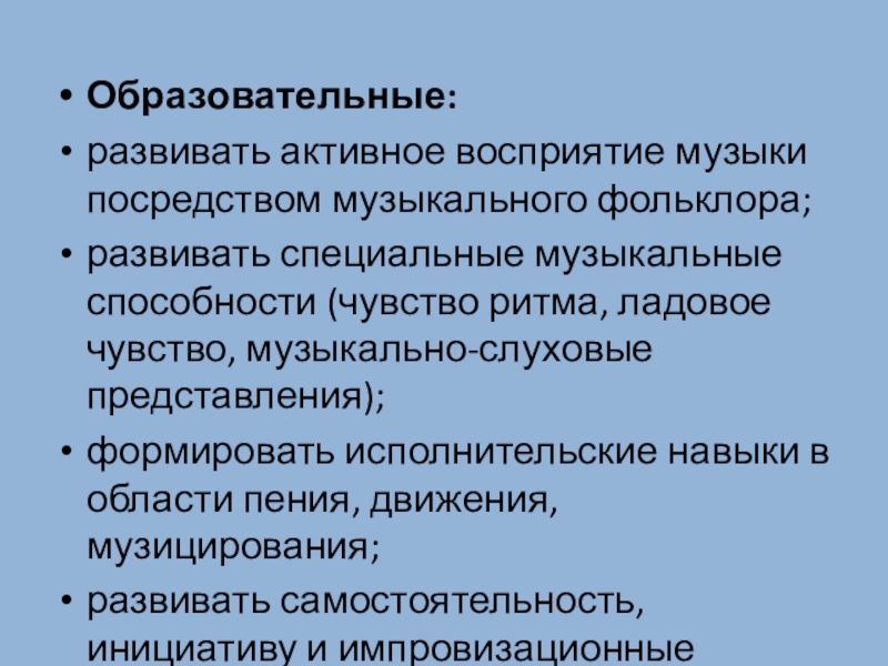 Образовательные:развивать активное восприятие музыки посредством музыкального фольклора;развивать специальные музыкальные способности (чувство ритма, ладовое чувство, музыкально-слуховые представления);формировать исполнительские