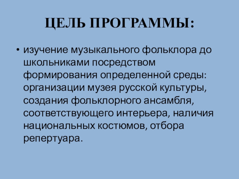 ЦЕЛЬ ПРОГРАММЫ:изучение музыкального фольклора до­школьниками посредством формирования определенной среды: организации музея русской культуры, создания фольклорного ан­самбля, соответствующего