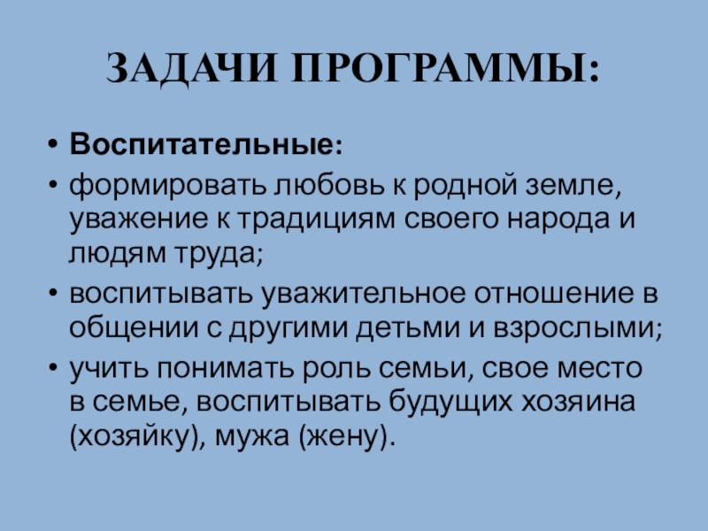 ЗАДАЧИ ПРОГРАММЫ:Воспитательные:формировать любовь к родной земле, уважение к традициям своего народа и людям труда;воспитывать уважительное отношение в